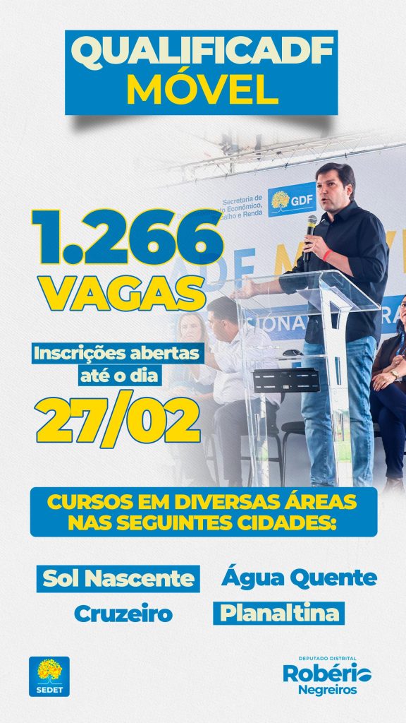 O período de inscrição começa nesta sexta-feira (13) e segue até o dia 27 deste mês. Os interessados devem preencher este formulário eletrônico. O projeto QualificaDF Móvel – idealizado com apoio do deputado distrital Robério Negreiros – destaca-se por levar estrutura itinerante de ensino às comunidades, facilitando o acesso da população aos cursos profissionalizantes, especialmente em áreas com maior vulnerabilidade social.